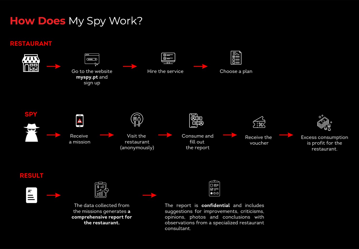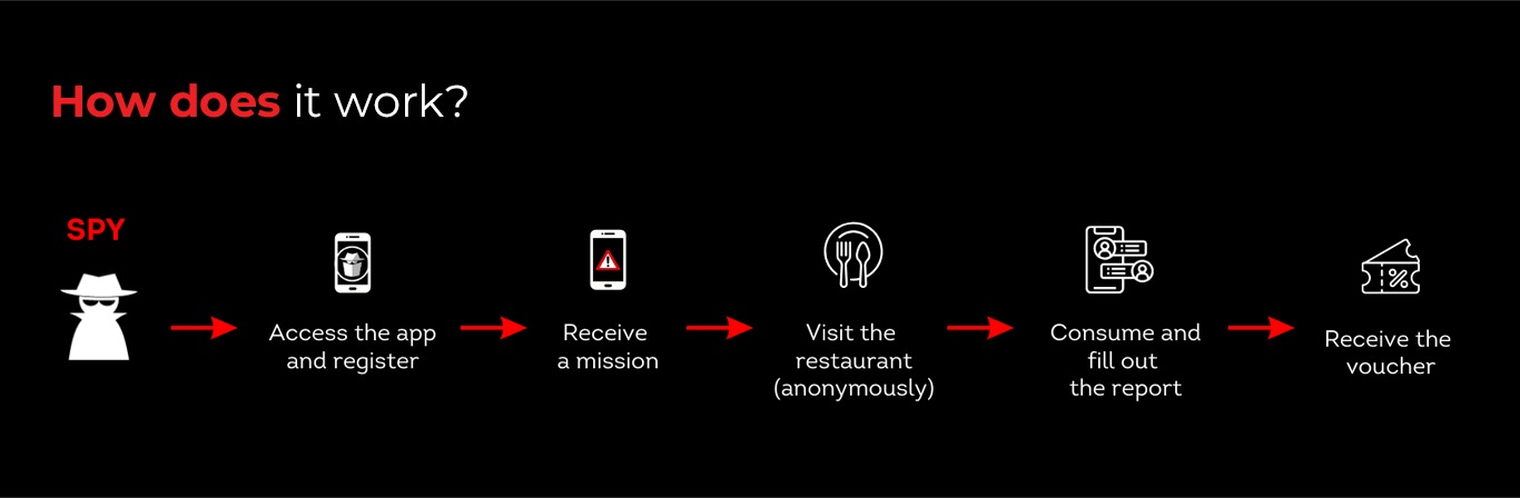 Visit www.myspy.pt/planos and choose the plan that suits you best. After this process, fill in the payment details, then access the MYSPY app to provide your restaurant’s information. This allows us to match ideal spies with your business.